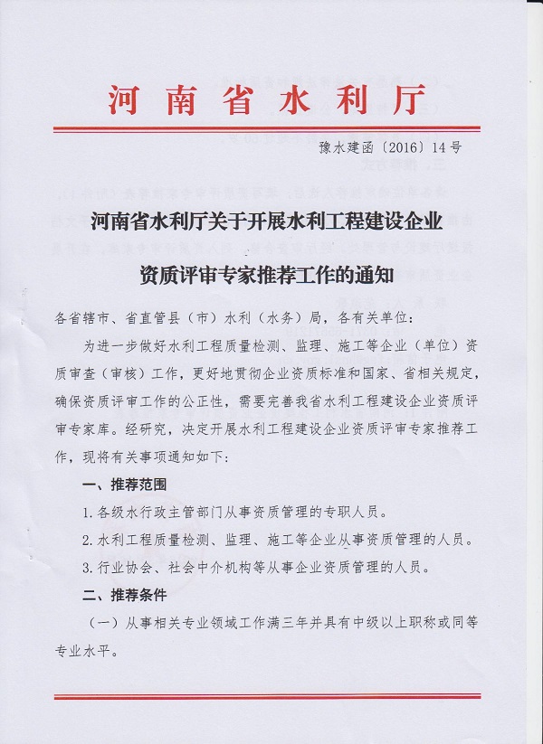 關于開展水利工程建設企業(yè)資質(zhì)評審專家推薦工作的通知